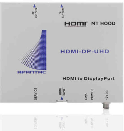 Apantac HDM-DP-UHD is a Crescent HDMI 2.0 to DisplayPort 1.2 Converter. This converter supports stereo audio, DisplayPort RBR/HBR/HBR2 link rate, and HDMI input bandwidth up to 18 Gbps.