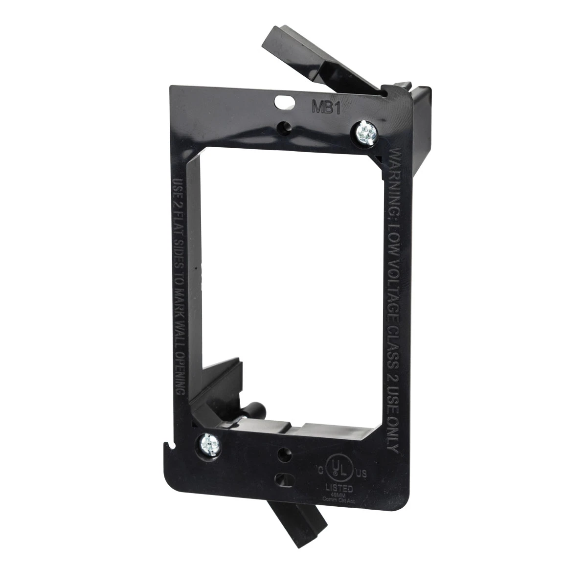 Single-gang, post-construction bracket for low-voltage devices. Install after the dry-wall is installed. Uses two swing-out wings to securely hold in place.