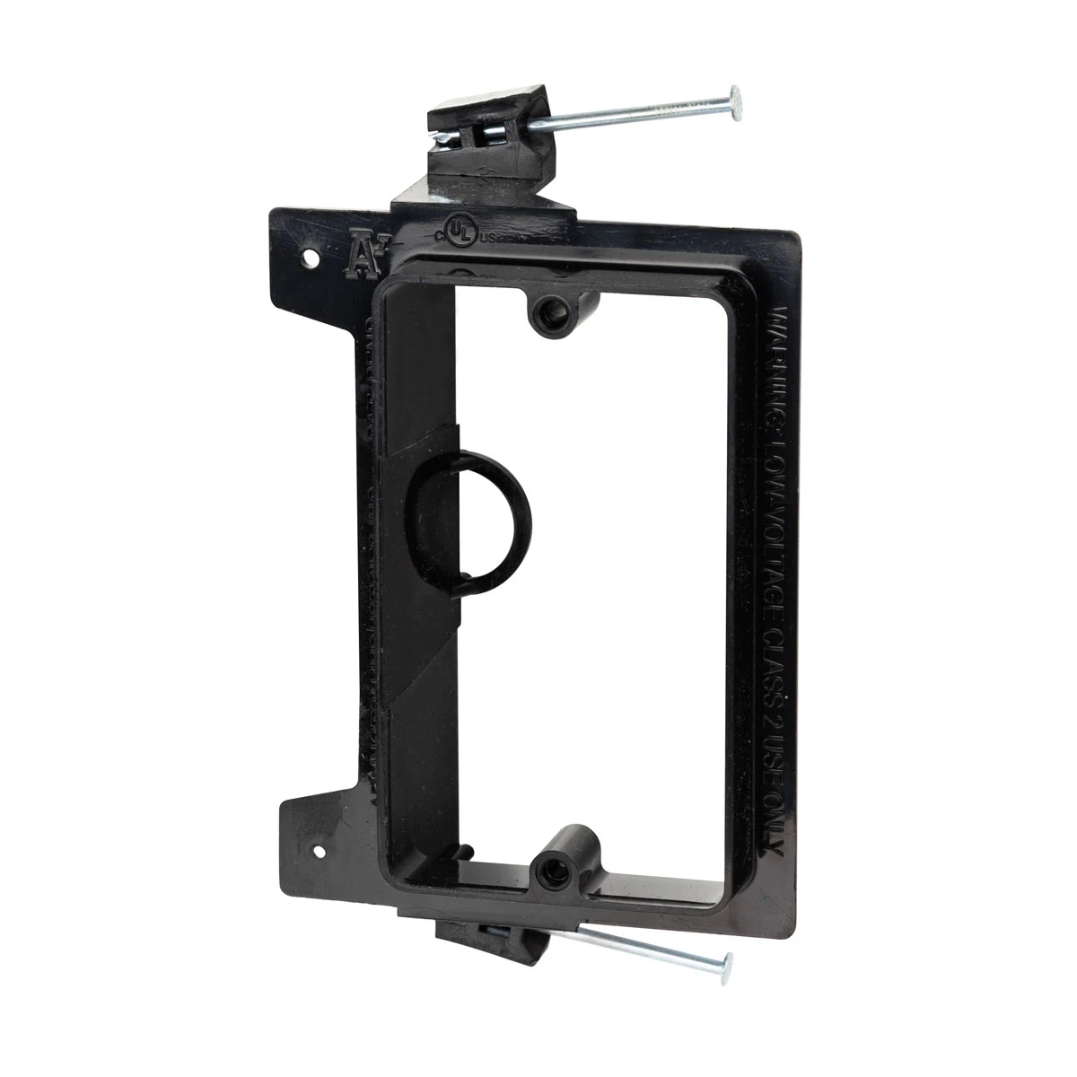 Single-gang, nail-in, pre-construction bracket for low-voltage devices. Install after framing, but before the dry-wall is installed.