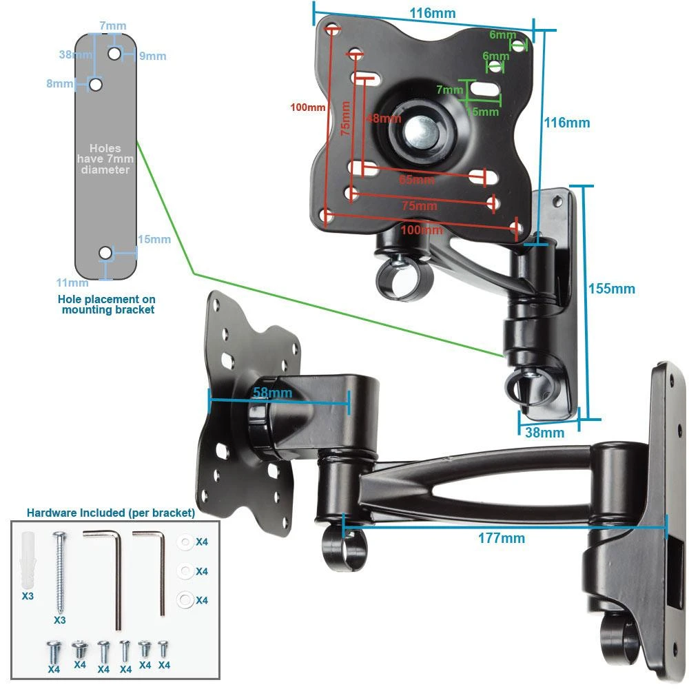 The mounting plate also works with TVs and monitors that include VESA standard 75mm or 100mm spacing.