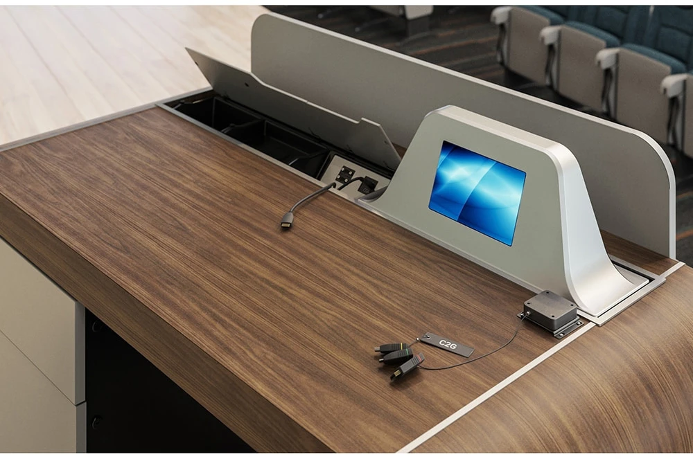 The Retractable Universal Mount attaches to any flat surface, like a table or lectern, providing mounting flexibility to fit your environment best. The retractor extends out to 4.9ft, ensuring that the adapters are always within reach when needed, and the retractor tested to over 20,000 extension cycles for long service life.