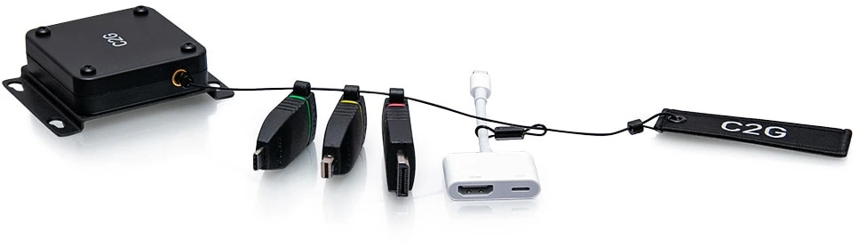 The Patented (US 11,575,235) C2G C2G29890 Retractable Universal 4K HDMI Adapter Ring is the perfect addition to conference rooms, huddle spaces, lecture halls, or classrooms to make sure that anyone can connect. The standard configuration includes the adapters to connect nearly any device to the in-room display while supporting up to a 4K video resolution. C2G offers various connection combinations that can include HDMI to DisplayPort, Lightning, Mini DisplayPort, Micro HDMI, Mini HDMI, USB-C, VGA adapters to meet connectivity challenges. If you need additional connectivity, C2G has recently launched USB-A to USB-C Dongle Adapters that support USB 2.0 (480 Mbps) data only transmission.