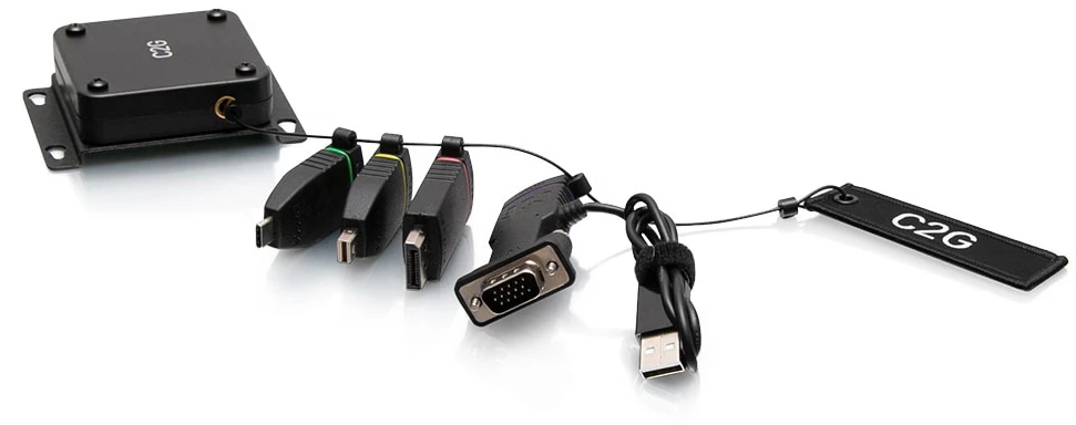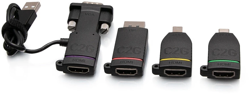 The Patented (US 11,575,235) C2G C2G29892 Retractable Universal 4K HDMI Adapter Ring is the perfect addition to conference rooms, huddle spaces, lecture halls, or classrooms to make sure that anyone can connect. The standard configuration includes the adapters to connect nearly any device to the in-room display while supporting up to a 4K video resolution. C2G offers various connection combinations that can include HDMI to DisplayPort, Lightning, Mini DisplayPort, Micro HDMI, Mini HDMI, USB-C, VGA adapters to meet connectivity challenges. If you need additional connectivity, C2G has recently launched USB-A to USB-C Dongle Adapters that support USB 2.0 (480 Mbps) data only transmission.