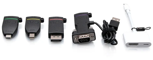 The Patented (US 11,444,419 B2) C2G C2G29887 Universal 4K HDMI Adapter Rings are the perfect addition to conference rooms, huddle spaces, lecture halls, or classrooms to ensure that anyone can connect. The standard configuration includes the adapters to connect nearly any device to the in-room display while supporting up to a 4K video resolution. C2G offers various connection combinations that can include HDMI to DisplayPort, Lightning, Mini DisplayPort, Micro HDMI, Mini HDMI, USB-C, VGA adapters to meet connectivity challenges. If you need additional connectivity, C2G has recently launched USB-A to USB-C Dongle Adapters that support USB 2.0 (480 Mbps) data only transmission.