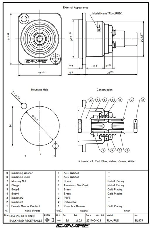 Canare RJ-JRUD RCA Flush-Mount Receptacle Jack to Jack (feedthru) Neutrik D Series