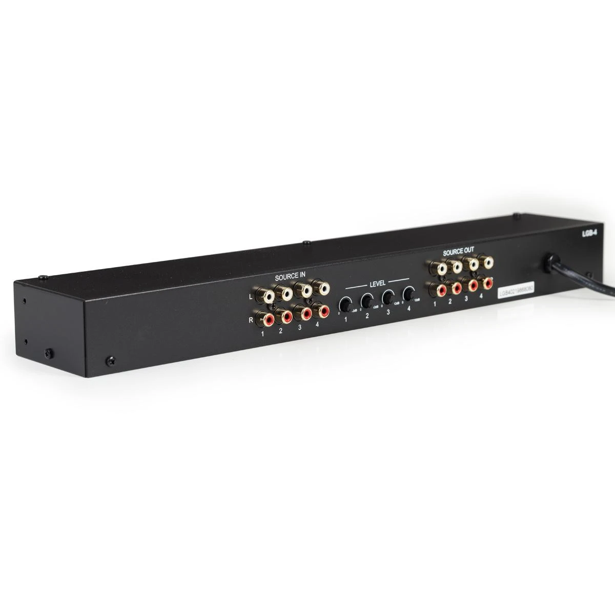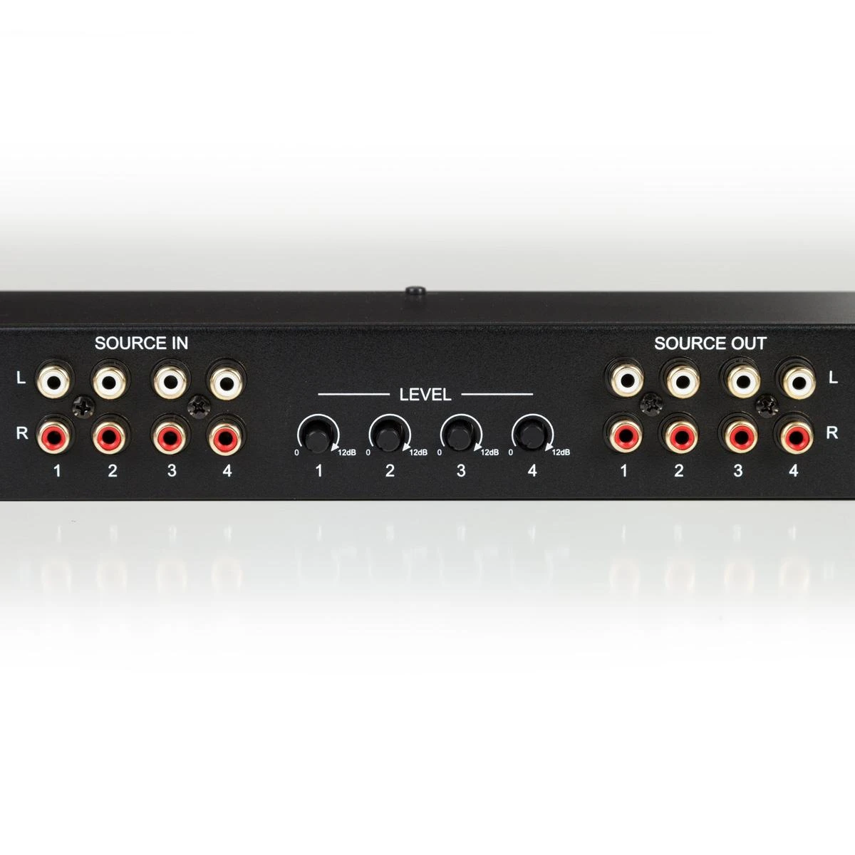 Increases the line level output by up to 12dB for up to four audio components. Simply connect the stereo line level outputs (using stereo RCA-type connectors) to the stereo inputs on the LGB-4. Connect the four stereo outputs on the LGB-4 to inputs on your amplifier, receiver, or whole-house audio controller. Adjust the level knob for each device until all four outputs are at the same volume level.