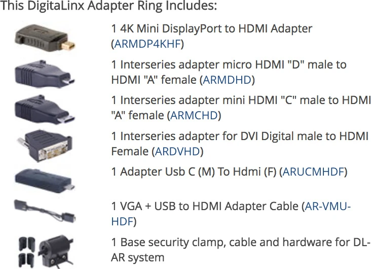 Make Liberty’s breakthrough DL-AR6955 adapter ring part of every install and feel the love from your customers! Our patent-pending tensile aircraft strength ring & clamp locks to an HDMI cable (sold separately) keeping all of your adapters at your fingertips. Not only do you get a solid and reliable connection, but the adapters are secured to the HDMI cable so they can’t get lost before the next presentation.