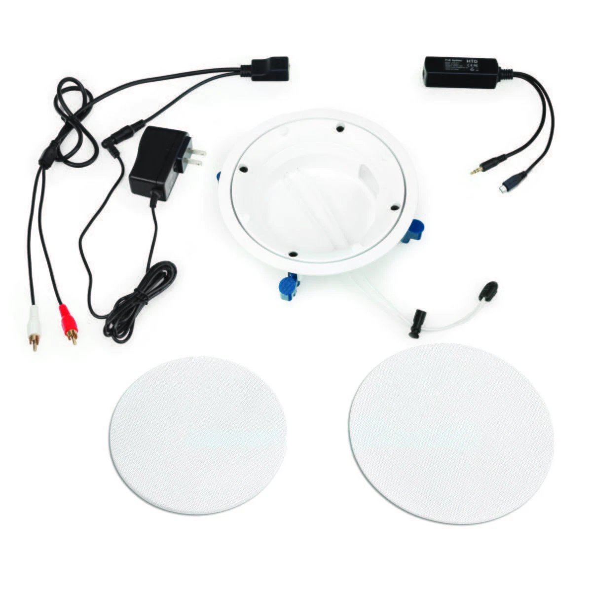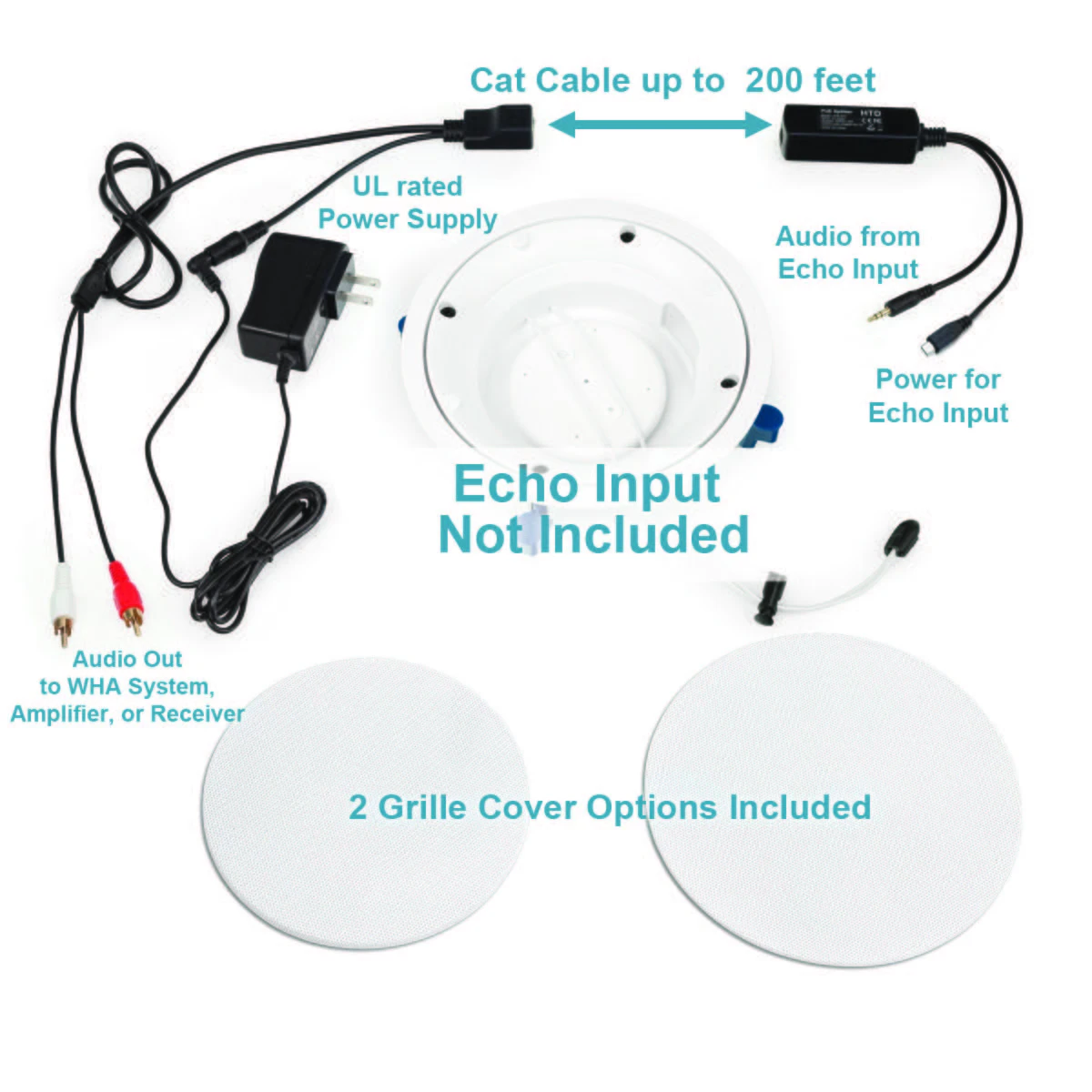 Our innovative solution provides all you need to custom install your Amazon Echo Input or Echo Dot Gen 1 & 2 (discontinued models) into the ceiling or wall of any room and extend Alexa’s audio output into your own speakers. A single Cat cable carries both the power for the Echo device and its audio signal back to your equipment over a distance up to 200 feet.