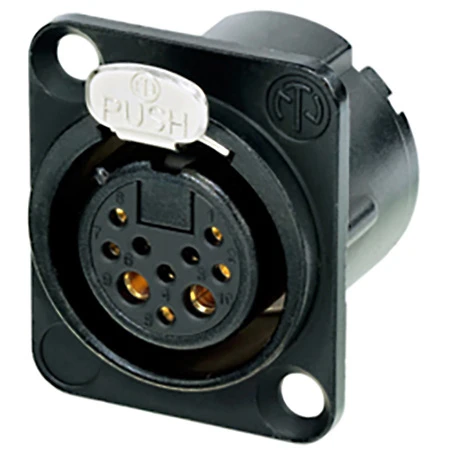 8 + 2 pole female D-size receptacle, black chrome metal housing, duplex ground contact