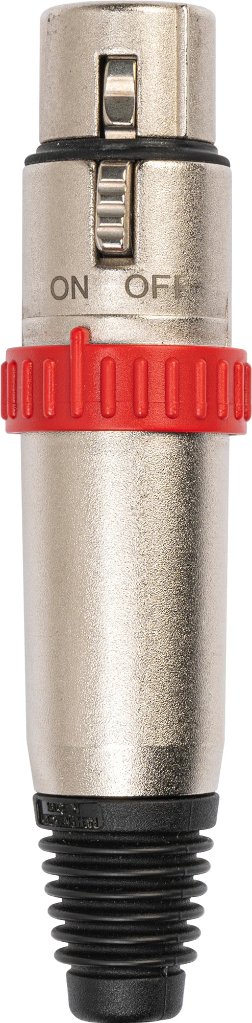 FX cable connector with noiseless ON-OFF switch short-circuiting contacts 2+3. For use with a microphone without switch.