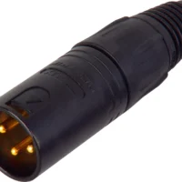 3 pole male cable connector with black metal housing and gold contacts.