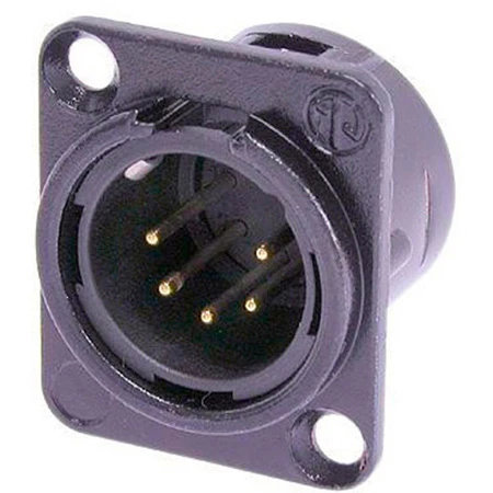 5 pole male receptacle, solder cups, black metal housing, silver contacts
