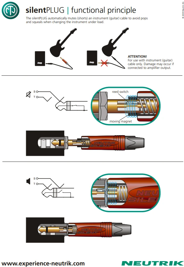 The silentPLUG automatically mutes (shorts) an instrument (guitar) cable to avoid pops and squeals when changing the instrument (guitar) under load. The integrated silent switch is based on REED-technology and guarantees a lifetime beyond 1000 mating cycles.