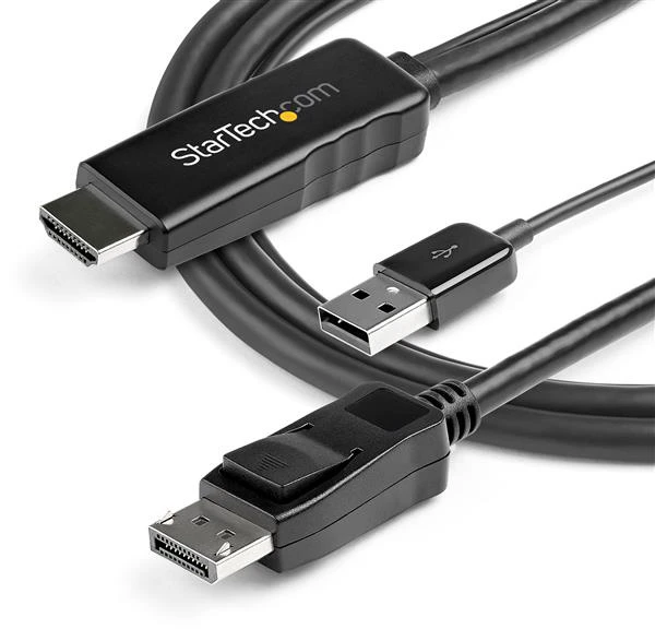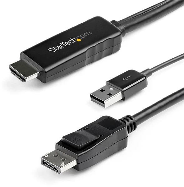 This 3 m (10ft.) HDMI to DisplayPort cable with USB power from StarTech lets you connect an HDMI video source, such as your laptop, desktop, Blu-ray™ player, or camera, to a DisplayPort monitor or projector without the need for additional video cables. The adapter cable features male connectors enabling you to connect your video source directly to the display, with no need for additional adapters or cables.