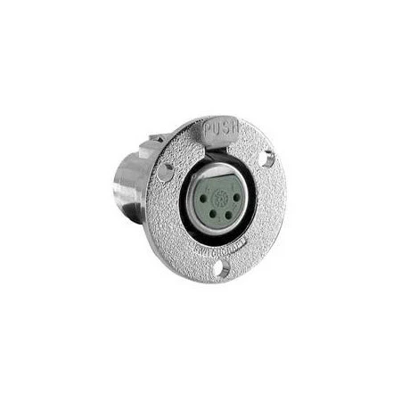 Female receptacle for panel or chassis mounting. Flange has three .140 inch (3.57 mm) diameter holes for #5-40 mounting screws (not supplied). Mounts from front of panel or chassis in 0.953 inch (24.21 mm) diameter hole.